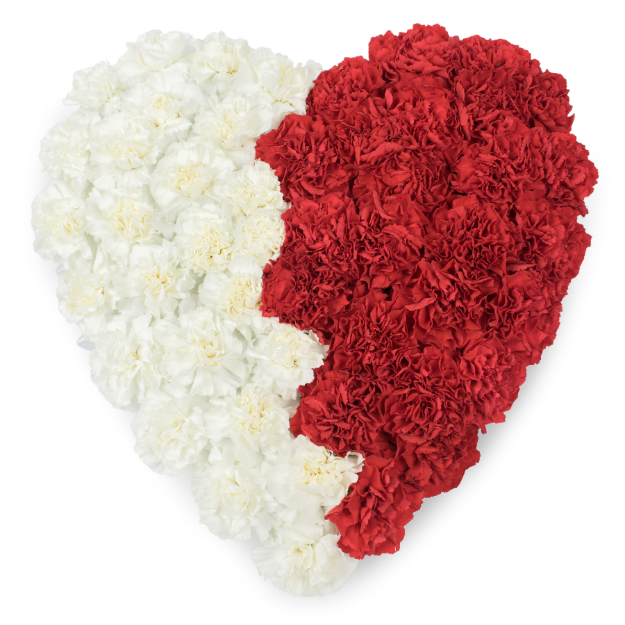 Celebrate timeless elegance with our Carnation Heart Bouquet, crafted by Handy Flowers. This beautiful arrangement features a blend of white and red carnations, artfully arranged into a heart shape to symbolize your heartfelt emotions.